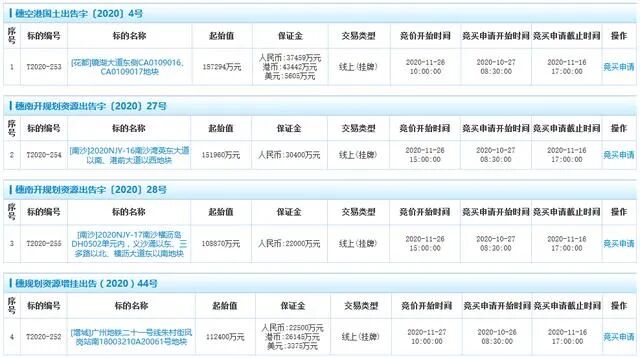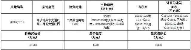 2020NJY-16地塊公告號(hào)為穗南開規(guī)劃資源出告字〔2020〕27號(hào),位于南沙灣英東大道以南、港前大道以西。土地面積30623㎡(DN0501030地塊14201㎡,DN0501031地塊16422㎡),計(jì)容建筑面積≤101056㎡(DN0501030地塊≤46863㎡、DN0501031地塊≤54193㎡),起始價(jià)151960萬(wàn)元,最高限價(jià)201820萬(wàn)元,競(jìng)買保證金3.04億元,增加幅度1500萬(wàn)元,將于11月26日開始限時(shí)競(jìng)價(jià)。